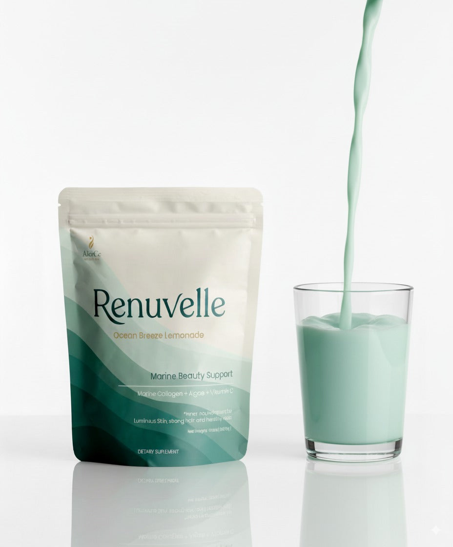 Renuvelle Ocean Breeze Lemonade is a premium marine collagen blend crafted to support radiant skin, stronger hair, and healthy nails.